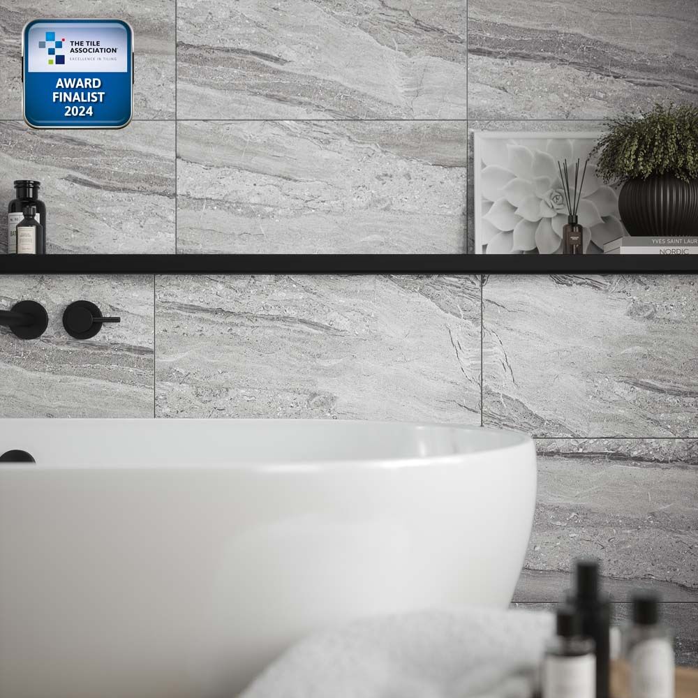 Large, Ceramic wall tile in matt grey with n0n-rectified edges. For use in kitchens and bathrooms, great for underfloor heating.
